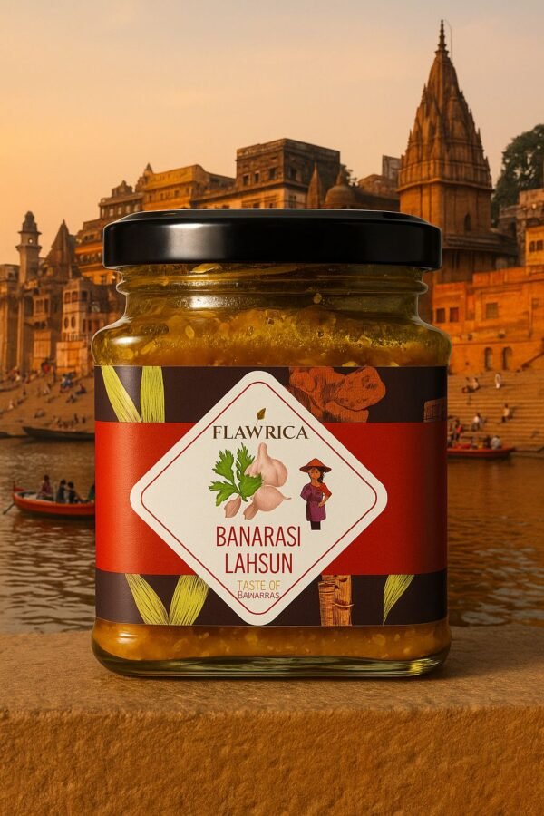 Banarasi Lahsun Achar – a bold and flavorful garlic pickle, infused with Banaras’s authentic spices and slow-matured in mustard oil for a rich, zesty taste.”