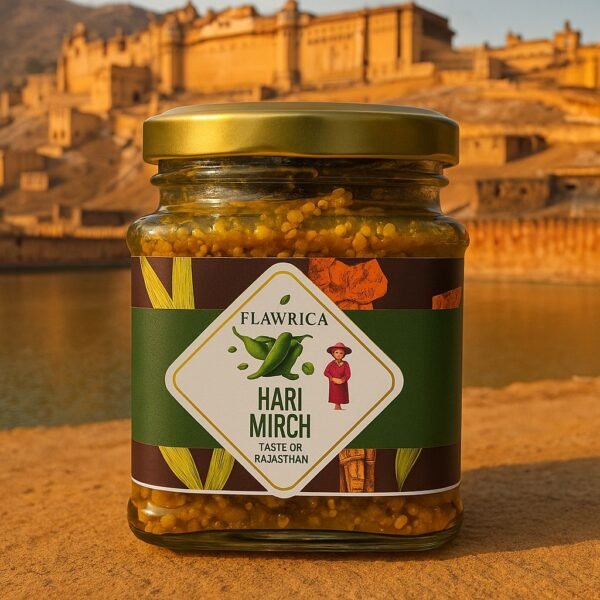 Flawrica Rajasthani Hari Mirch Aachar is a traditional pickle made from fresh, tender green chilies sourced from Rajasthan, blended with aromatic spices and mustard oil. Known for its bold, spicy kick, this pickle captures the true essence of Rajasthani kitchens where heat and flavor go hand in hand. Each bite is zesty, pungent, and full of authentic taste, making it the perfect companion to parathas, khichdi, or any Indian meal. Handcrafted using age-old recipes, this pickle is free from artificial preservatives—delivering nothing but pure, fiery goodness from Rajasthan’s culinary heritage.